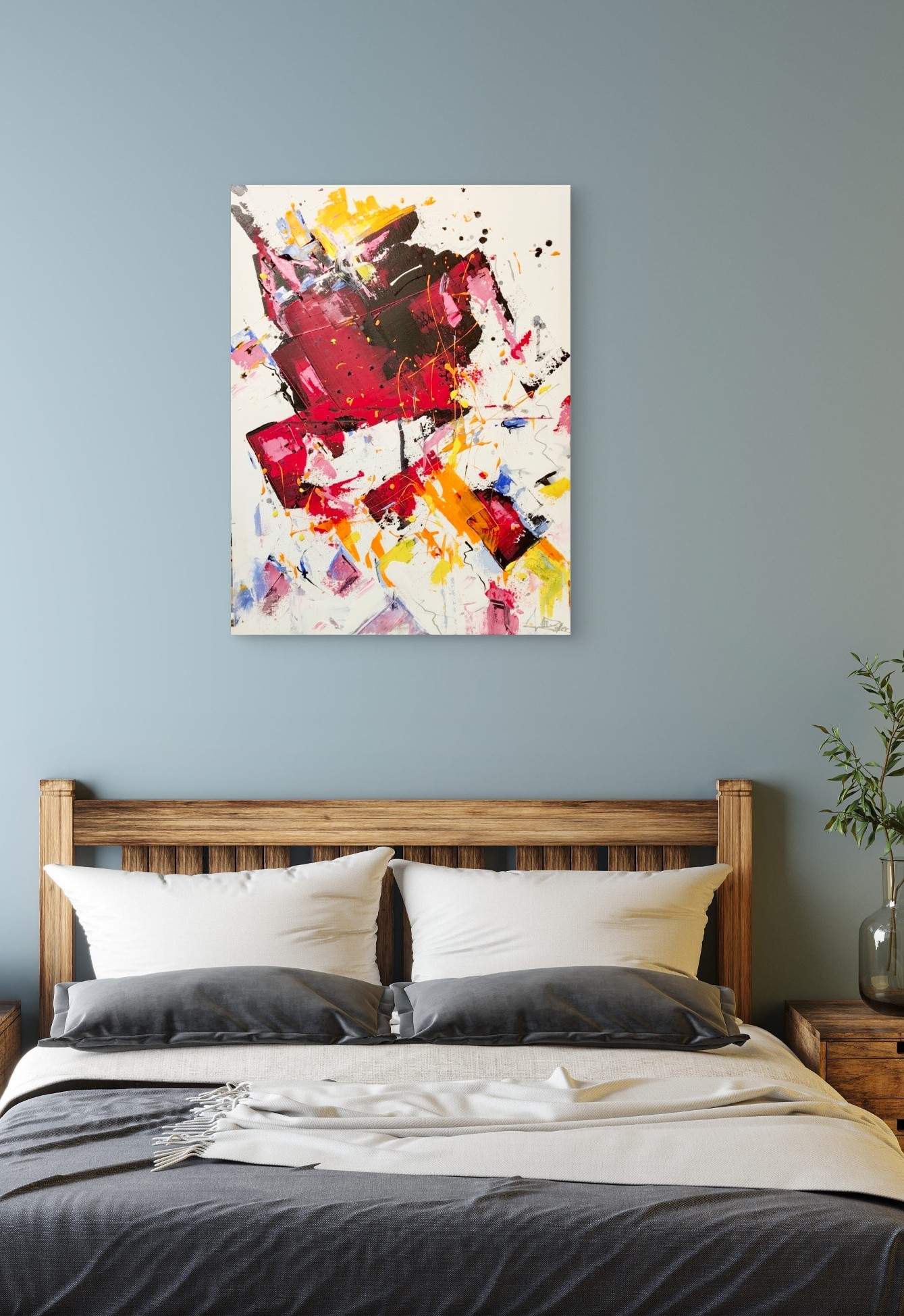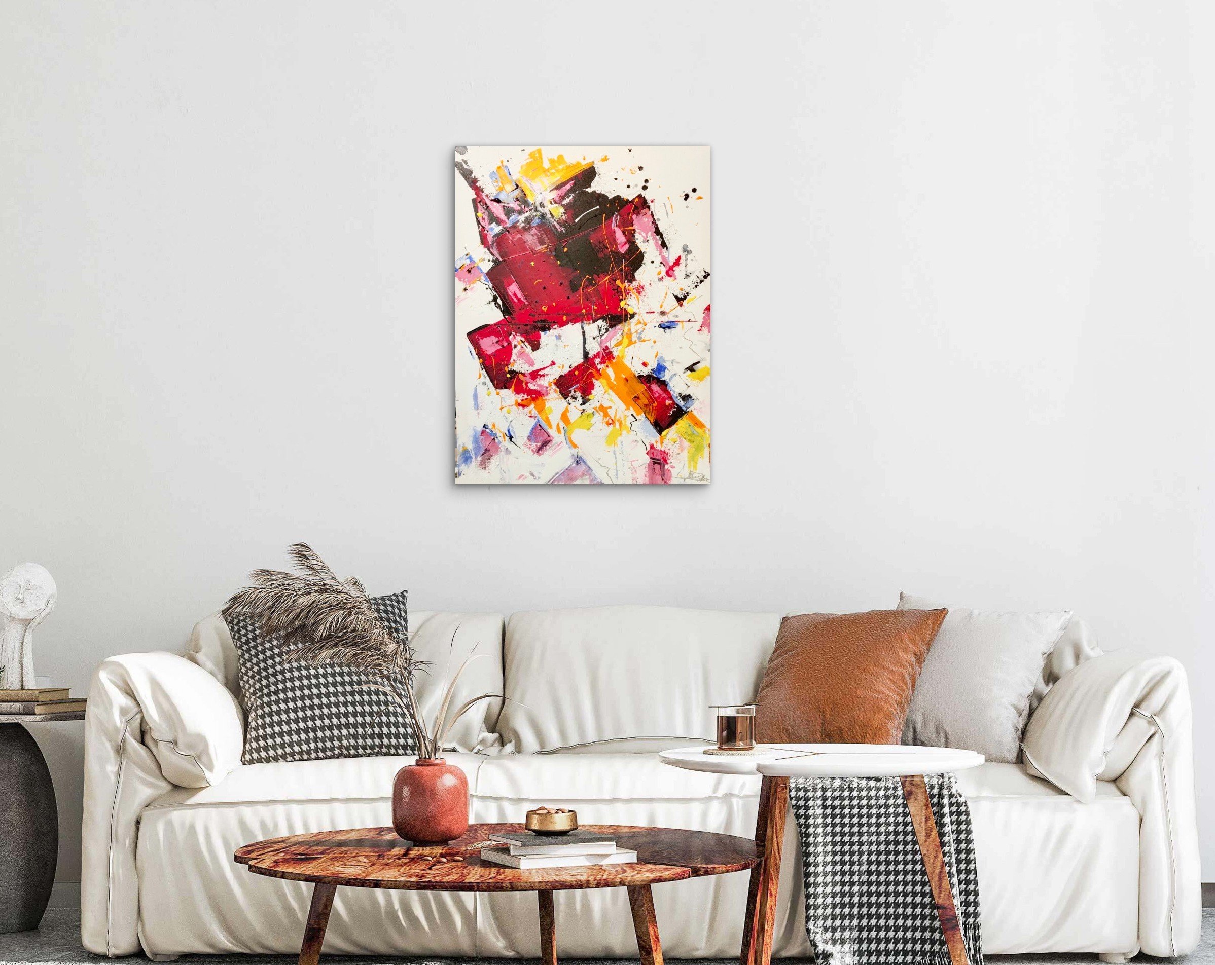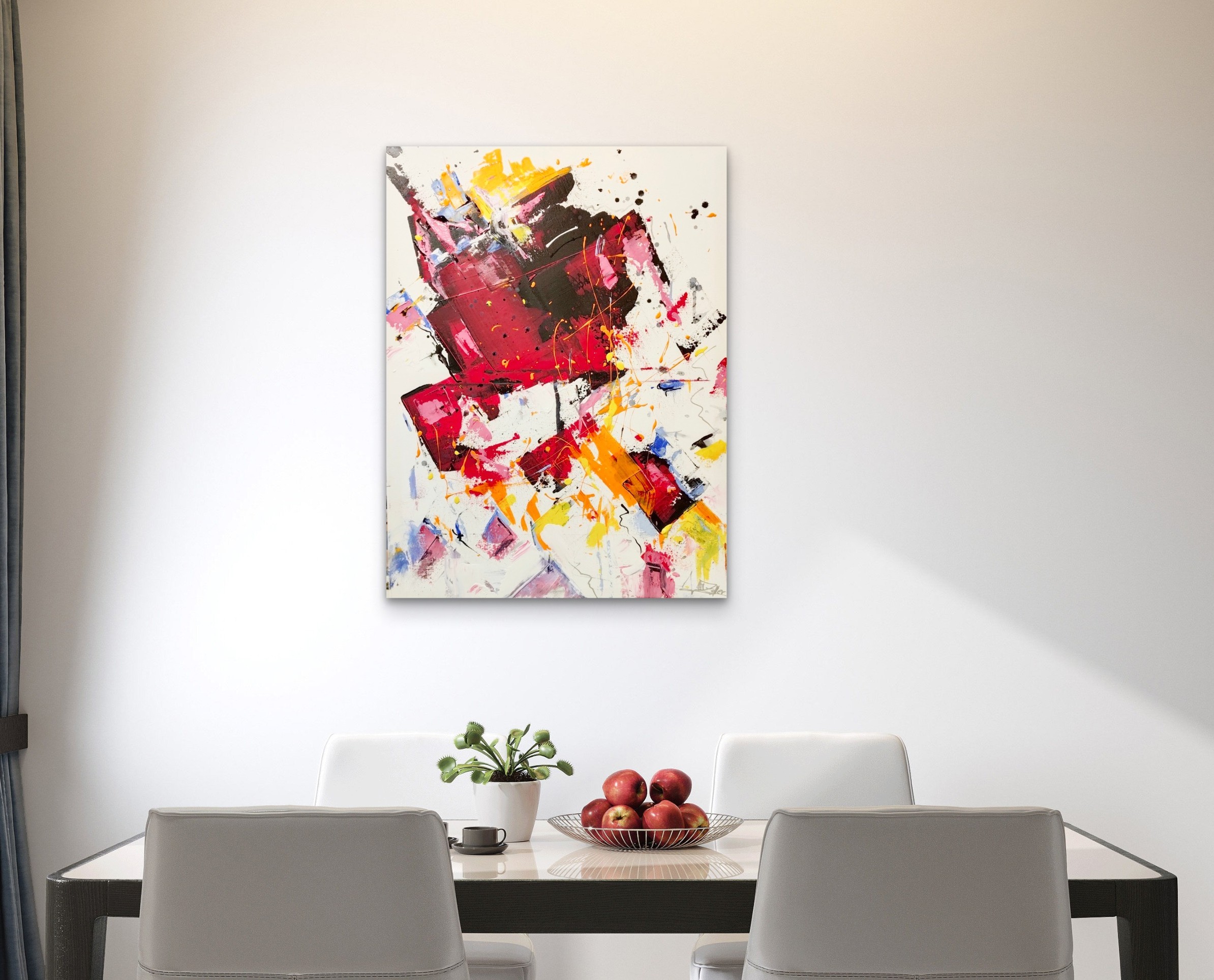 Dieses lebendige Acrylgemälde besticht durch eine kraftvolle Kombination aus Rot-, Pink-, Gelb- und Orangetönen, ergänzt von schwarzen Akzenten und dynamischen Farbspritzern. Die expressiven Pinselstriche und spontanen Linien verleihen dem Werk eine moderne, energiegeladene Ästhetik, die zur eigenen Interpretation einlädt. Ideal für Fans abstrakter Kunst. Signiert von Künstler Zoller.