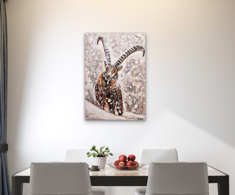 Dieses eindrucksvolle Acrylgemälde präsentiert einen majestätischen Steinbock mit imposanten, geschwungenen Hörnern, der einem Schneesturm standhält. Die warmen Brauntöne seines Fells stehen im Kontrast zu dem kühlen Weiß und den zarten Farbspritzern im Hintergrund, die die winterliche Atmosphäre einfangen. Ein beeindruckendes Stück Naturkunst. Signiert von Künstler Zoller.